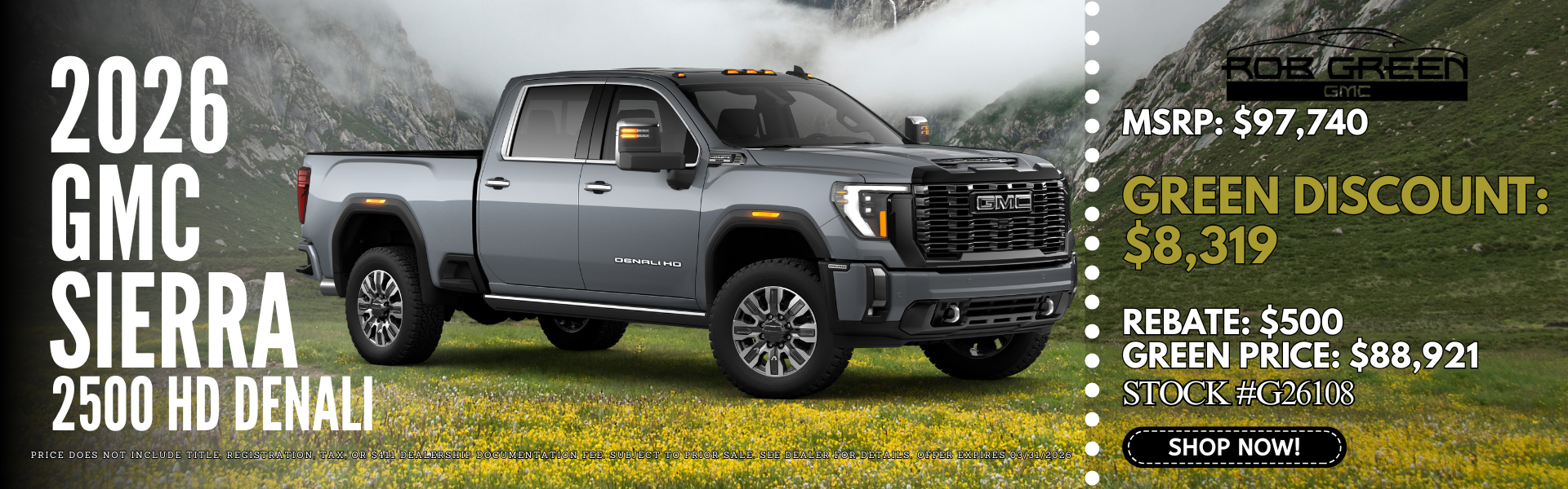 PRICE DOES NOT INCLUDE TITLE, REGISTRATION, TAX, OR $411 DEALERSHIP DOCUMENTATION FEE. SUBJECT TO PRIOR SALE. SEE DEALER FOR DETAILS. OFFER EXPIRES 03/31/2026