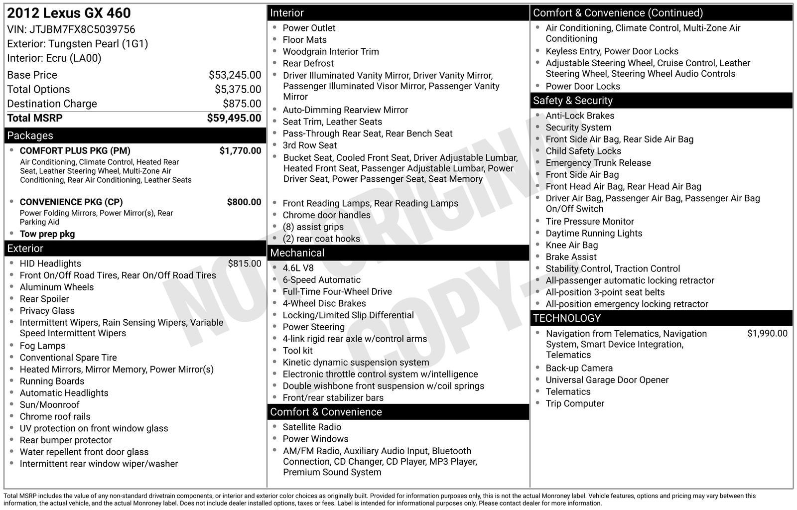 2012 Lexus GX 460 Tungsten Pearl 4WD 4.6L V8 DOHC Dual VVT-i 32V 6-Speed Automatic with Sequential Shift ECT