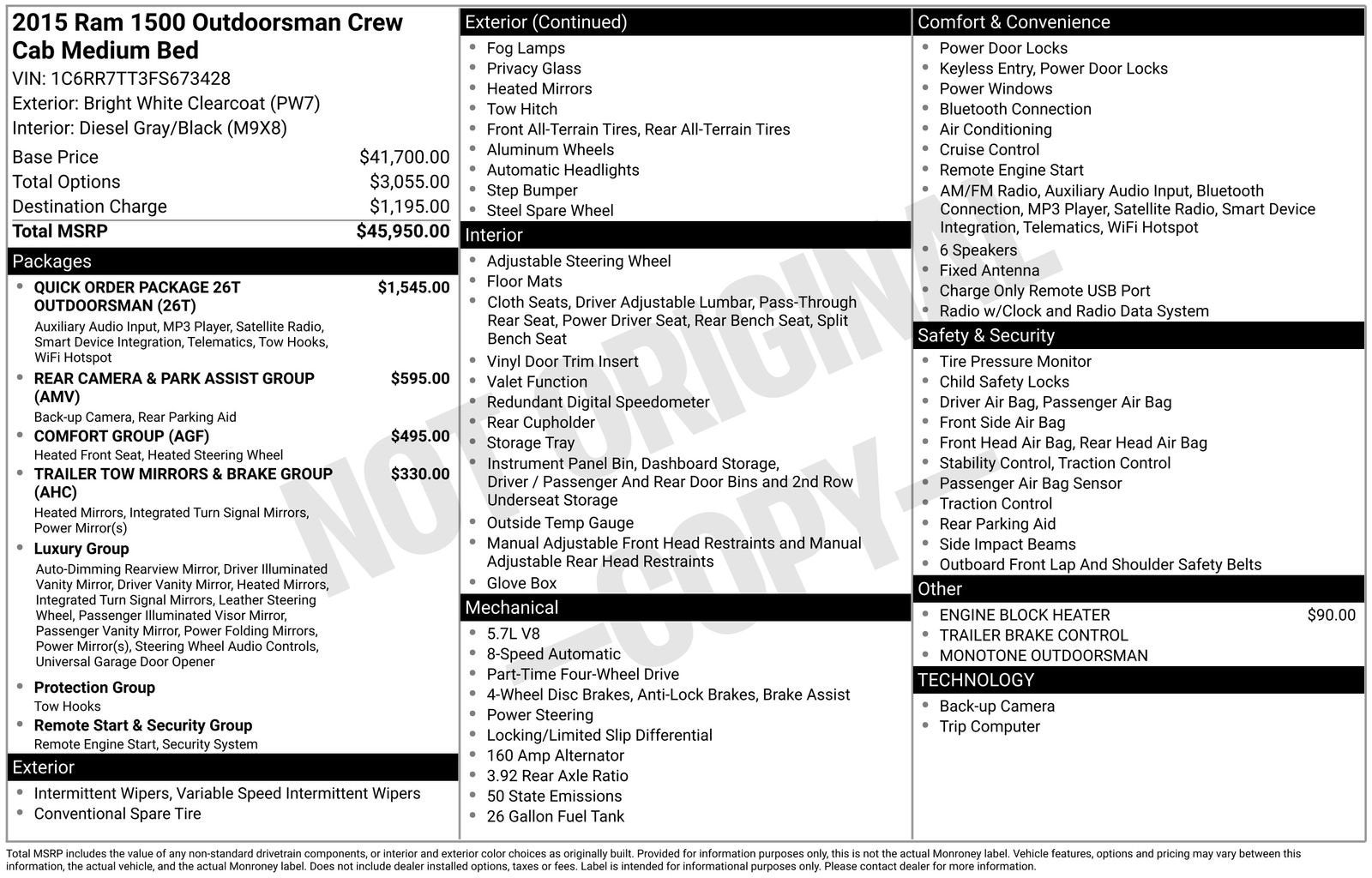 2015 Ram 1500 Outdoorsman Bright White Clearcoat 4WD HEMI 5.7L V8 Multi Displacement VVT 8-Speed Automatic