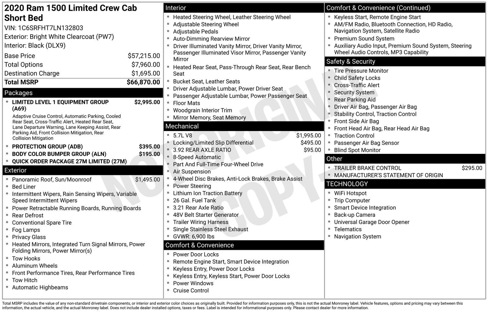 Elevate your driving experience with this exceptional 2020 Ram 1500 Limited. Boasting a powerful HEMI 5.7L V8 engine, 4-wheel drive, and an impressive 21 MPG on the highway, this truck delivers both performance and efficiency.Standout features include:• LIMITED LEVEL 1 EQUIPMENT GROUP with Adaptive Cruise Control, Parallel & Perpendicular Park Assist, Ventilated Rear Seats, and Full Speed Forward Collision Warning Plus• Dual-Pane Panoramic Sunroof• Anti-Spin Differential Rear Axle• Protection Group with Skid Plates• Body Color Bumper GroupThe interior of this Ram 1500 Limited is equally impressive, with premium leather-trimmed bucket seats, heated and ventilated front and rear seats, and a heated steering wheel. The Uconnect 12 infotainment system with navigation keeps you connected and entertained on the go.Safety is a top priority, with features like Lane Keep Assist, Front Collision Warning Plus, and the ParkView Rear Back-Up Camera ensuring your peace of mind on the road.With a sleek white exterior and just 56,395 miles, this 2020 Ram 1500 Limited is a true standout in its class. Imagine the confidence and capability you'll feel behind the wheel of this exceptional truck.Elevate your driving experience and make this Ram 1500 Limited your own. Contact us today to schedule a test drive and discover the difference it can make in your daily commute and weekend adventures.WHY BUY FROM ROB GREEN GMCEvery vehicle receives an intensive multi-point inspection in our world-class service centerAll work completed by factory-trained, certified techniciansOne full year of free maintenance included with every purchaseTrusted, locally owned dealership committed to exceptional customer care