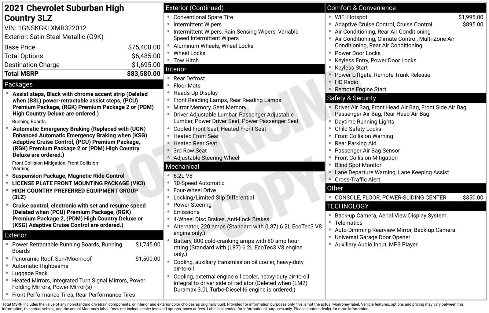 2021 Chevrolet Suburban High Country Satin Steel Metallic 4WD EcoTec3 6.2L V8 10-Speed Automatic with Overdrive