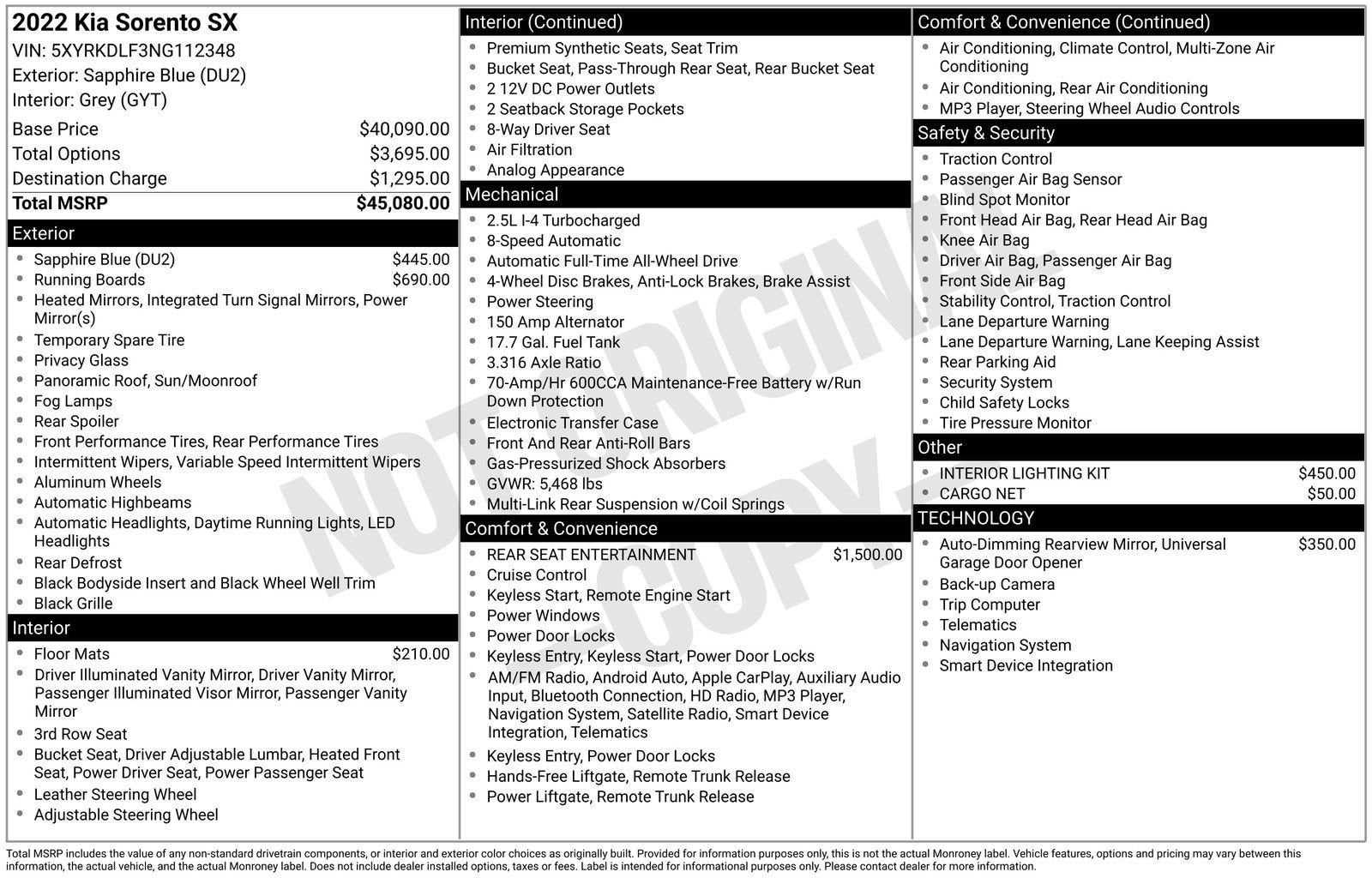2022 Kia Sorento SX Sapphire Blue AWD 2.5L I4 DGI Turbocharged DOHC 16V LEV3-ULEV70 281hp 8-Speed DCT