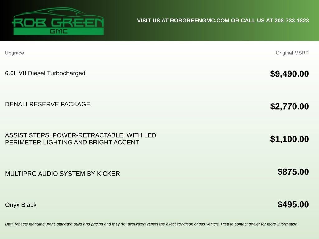 Discover the unparalleled power and refined luxury of the 2024 GMC Sierra 2500HD Denali. This exceptional heavy-duty pickup is engineered to conquer any challenge, whether you're tackling tough jobs or seeking a commanding presence on the road.• Duramax 6.6L V8 Turbodiesel engine delivering an impressive 470 horsepower and 975 lb-ft of torque• Denali Reserve Package with advanced technology and premium features• X31 Off-Road Package for exceptional capability in any terrain• Bose Premium 7-Speaker Sound System and MultiPro Audio System by Kicker for an immersive listening experience• Power-retractable assist steps with LED perimeter lighting for effortless entry and exit• Trailer Tire Pressure Monitor Sensors and Trailer Cam Provisions to ensure your towing setup is secure and confidentThe 2024 Sierra 2500HD Denali is a true masterpiece of engineering, blending uncompromising performance with unparalleled refinement. From the bold Denali grille to the premium leather-appointed interior, every detail has been meticulously crafted to elevate your driving experience.Imagine the power and control at your fingertips, with the Duramax diesel engine providing the muscle to tackle any job. The 10-speed automatic transmission and 4WD system ensure seamless power delivery and exceptional traction, even in the most challenging conditions.Step inside the cabin and be enveloped in the luxurious Denali-exclusive appointments. Heated and ventilated front seats, a heated steering wheel, and dual-zone automatic climate control create an oasis of comfort. The advanced technology features, including the Multicolor Head-Up Display and Wireless Charging, keep you connected and informed.When it comes to towing and hauling, the Sierra 2500HD Denali is in a class of its own. The Integrated Trailer Brake Controller and Trailer Tire Pressure Monitor Sensors provide the confidence and control you need to tackle any towing task with ease. The available Bed View Camera and Trailer Viewing Software ensure you can maneuver with precision, even when hitching up or navigating tight spaces.Experience the unrivaled capability and refined luxury of the 2024 GMC Sierra 2500HD Denali. This exceptional heavy-duty pickup is the ultimate expression of power, technology, and sophistication. Visit our showroom today to discover how this remarkable vehicle can transform your driving experience.WHY BUY FROM ROB GREEN GMCEvery vehicle receives an intensive multi-point inspection in our world-class service centerAll work completed by factory-trained, certified techniciansOne full year of free maintenance included with every purchaseTrusted, locally owned dealership committed to exceptional customer care