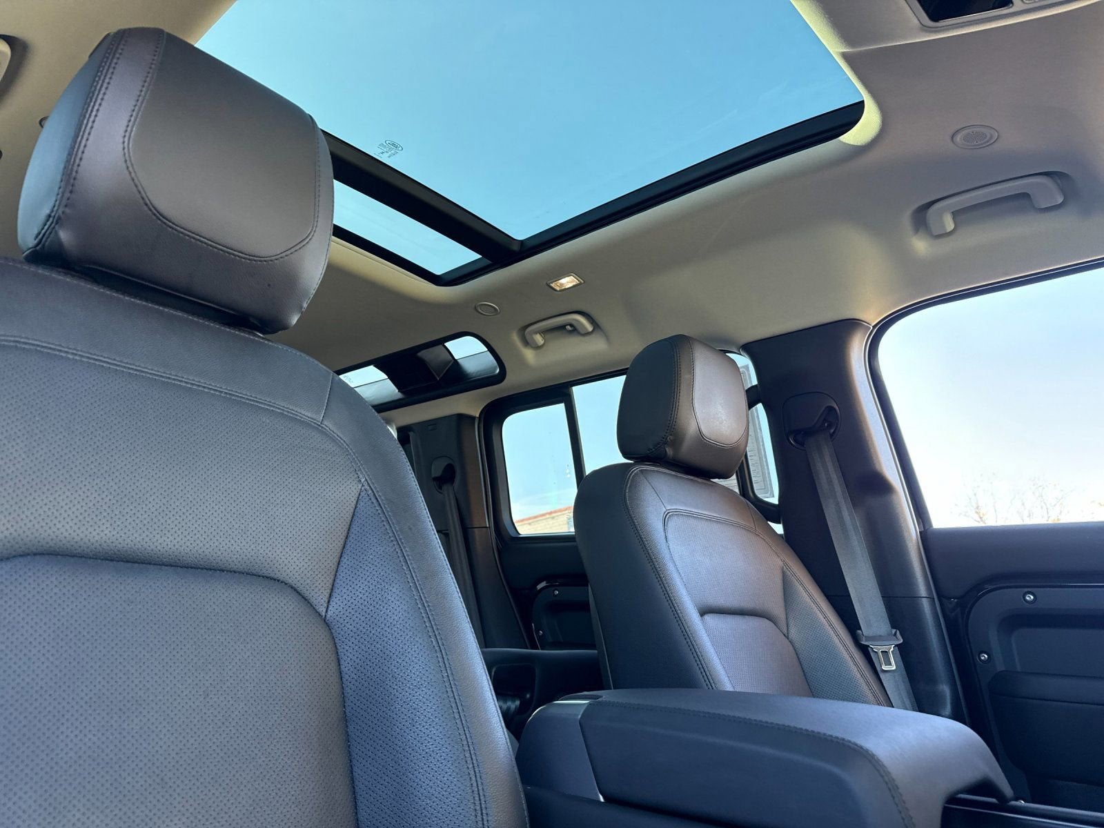 Step inside the Defender 110 S and you'll be greeted by a meticulously crafted interior that seamlessly blends modern luxury with timeless Land Rover design. Grained leather seating, a heated steering wheel, and a power-adjustable driver's seat with memory settings ensure unparalleled comfort and convenience.