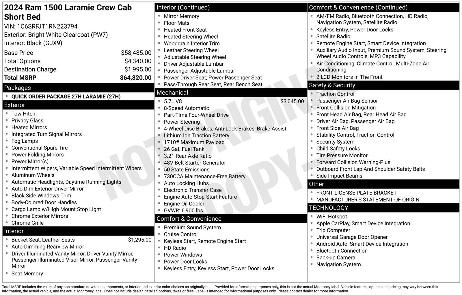 Experience the Power and Sophistication of the 2024 Ram 1500 LaramieThis impressive 2024 Ram 1500 Laramie is the perfect blend of capability, comfort, and cutting-edge technology. Boasting a powerful HEMI 5.7L V8 engine with eTorque technology, this truck delivers exceptional performance and efficiency, with an impressive 18 city/22 highway MPG. Adorned in a sleek White exterior, this Laramie model is equipped with a wealth of premium features that elevate the driving experience.• HEMI 5.7L V8 Multi Displacement VVT eTorque• Black, Leather Trimmed Bucket Seats• Bucket Seats with Full Length Upgraded Floor ConsoleThe Laramie's cabin is a sanctuary of refined luxury, with premium leather-trimmed seats, heated and ventilated front seats, and a heated steering wheel. Stay connected and entertained with the Uconnect 5 navigation system, featuring an 8.4-inch display, SiriusXM with 360L, and a premium 10-speaker audio system.This Ram 1500 also boasts an impressive array of advanced safety and driver-assist technologies, including ParkView Rear Back-Up Camera, Automatic Emergency Braking, Adaptive Cruise Control, and Lane Departure Warning. Whether you're tackling tough jobs or embarking on weekend adventures, this Laramie model is ready to take you there in style and comfort.Experience the power and sophistication of the 2024 Ram 1500 Laramie for yourself. Visit our showroom and take this exceptional truck for a test drive. We're confident you'll be impressed by its uncompromising performance, luxurious amenities, and exceptional value.WHY BUY FROM ROB GREEN GMCEvery vehicle receives an intensive multi-point inspection in our world-class service centerAll work completed by factory-trained, certified techniciansOne full year of free maintenance included with every purchaseTrusted, locally owned dealership committed to exceptional customer care